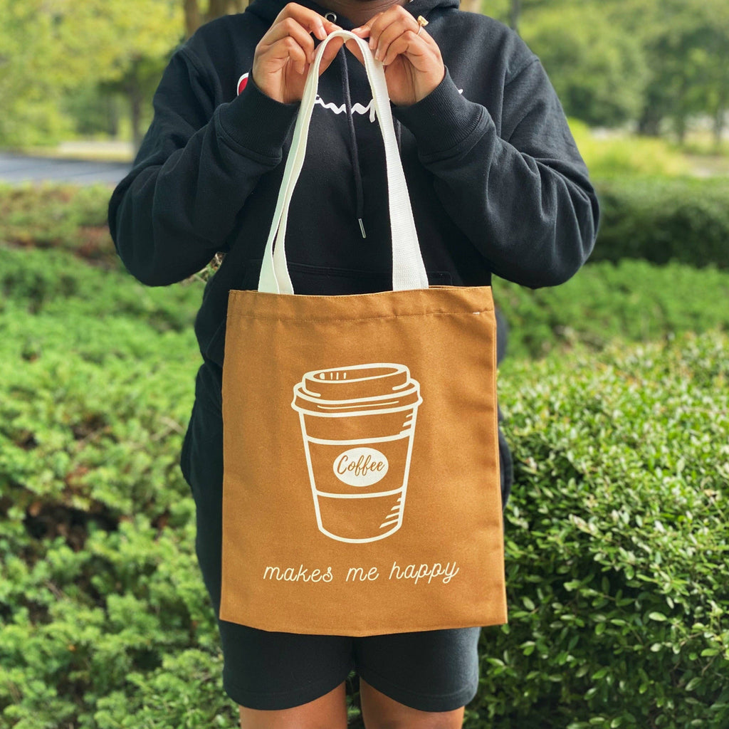 Make a statement with My Happy Canvas Tote Collection. Crafted with a perfect size to fit books and a small laptop or iPad, these bags offer a stylish way to carry your items while adding a positive message to your look. Pick your favorite happy from this collection and spread the joy all day long. Inside: one small pocket, no lining, white color Dimensions: approximately 13” x 15.5” for bag, 23” perimeter for shoulder strap One side graphic printing Ethically sourced, reusable, recyclable, no plastic packaging Machine washable cold gentle cycle and hang dry.