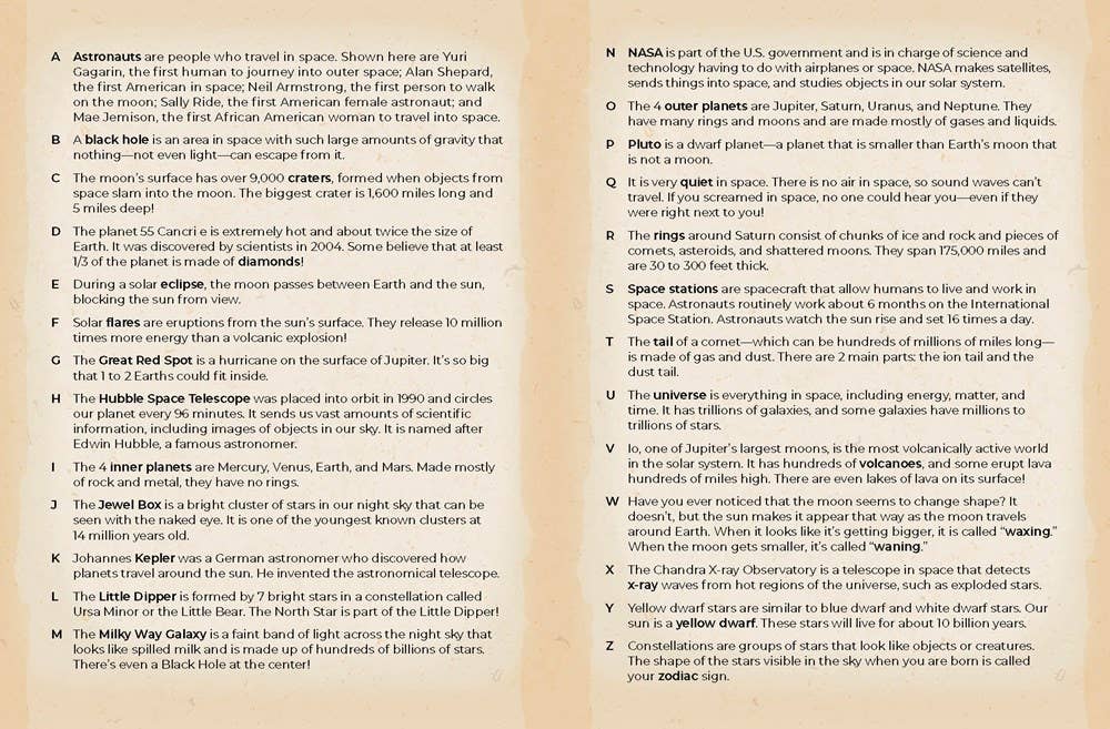 Learn with your toddler from A to Z all about the Universe and what can be found within it.