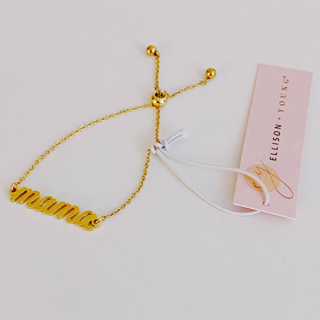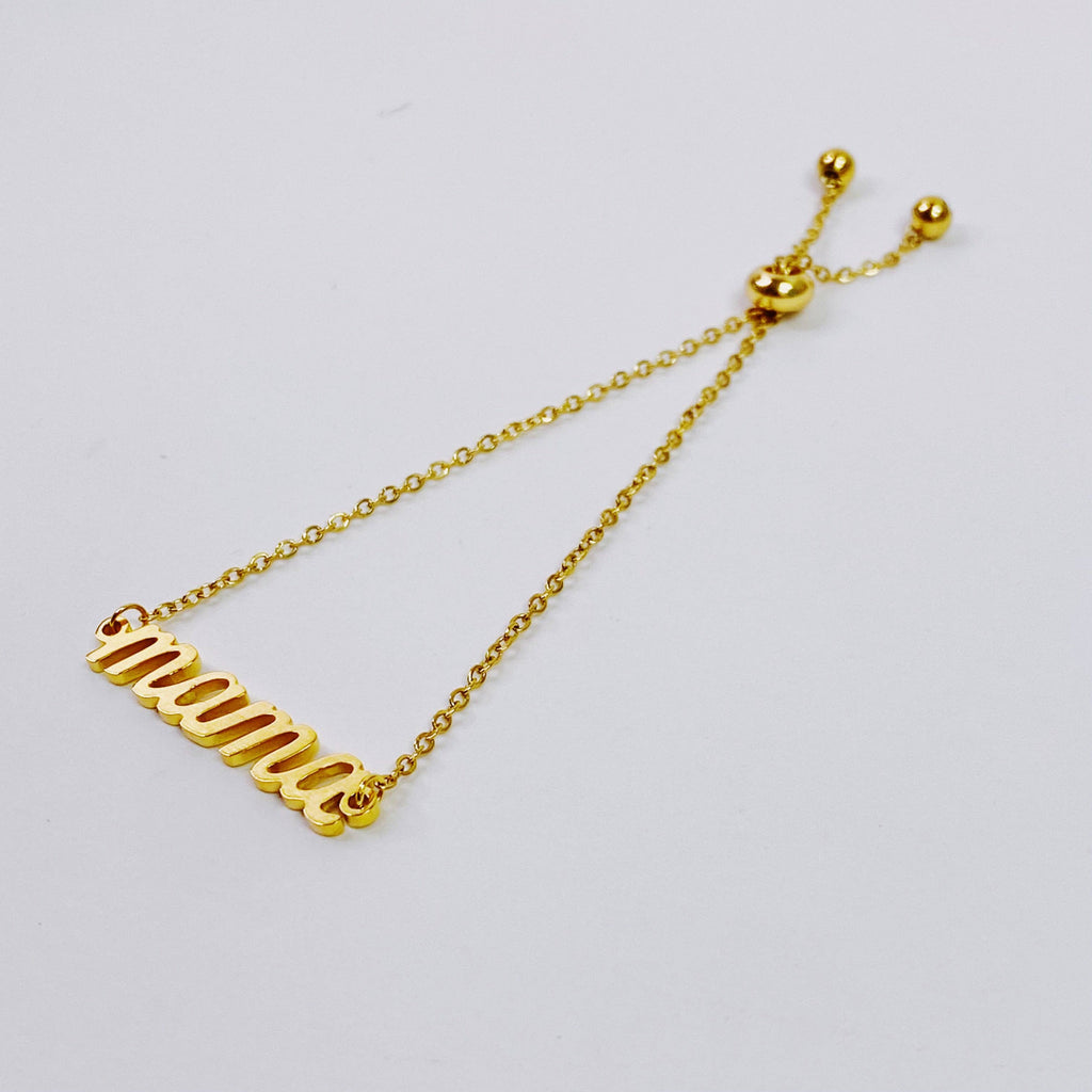 Its simple design features the word "MAMA" in a beautiful font, coupled with a dainty chain sliding bracelet. A perfect accessory for everyday wear.