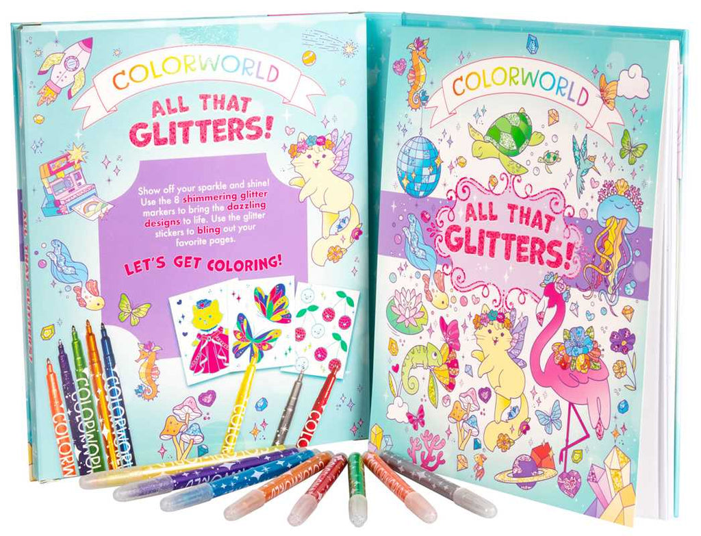 Make the world sparkle with this shining coloring kit that comes with 8 shimmering glitter markers! This magical coloring set comes with dozens of dazzling designs to color, from disco balls and bedazzled cowboy boots to unicorns and mermaids. With more than 30 glitter stickers included too, this is the perfect gift for kids who love to sparkle and shine!